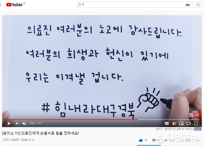 지난 3일 시작된 캠페인은 이철우 경북도지사가 의료진에게 전하는 손글씨 편지를 시작으로 유튜브, 페이스북 등 SNS를 통해 이어지고 있다.