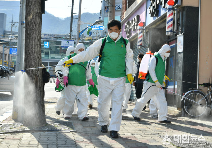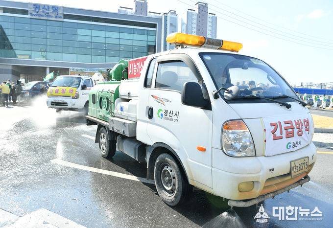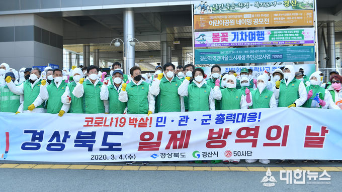 (대한뉴스 김기준 기자)=경산시(시장 최영조)와 경산시새마을회(회장 이동욱)에서는 코로나19 감염사태가 지역사회로 확산됨에 따라 매주 수요일, 일요일을 ‵일제 방역의 날′로 지정 운영하여 코로나19 전파 차단에 총력을 기울이기로 하였으며, 경산시에서는 보호복, 장갑, 마스크, 약품 등 방역장비를 적극 지원하기로 하였다.