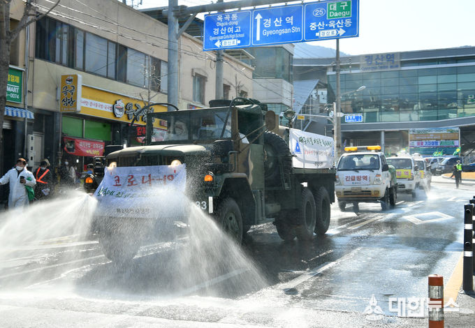 이날 방역활동에는 경산시새마을회원 50여명과 방제차량 5대, 제2작전사령부 및 7516부대 병력 62명과 화생방 제독차량 8대, 경산시 자율방재단 20명과 축협 방제차량 4대, 경상북도, 경산소방서, 경산시 등 공무원 20명 등 총 150여명의 인력과 17대의 방제차량이 투입되어 주요도로와 간선도로, 골목 등 곳곳에서 방역 소독작업을 실시했다.