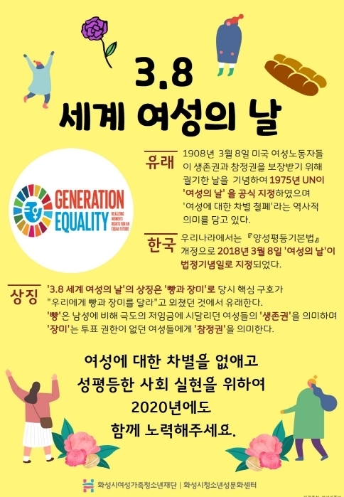 화성시청소년성문화센터가 '3.8 세계 여성의 날'을 기념하기 위한 금번 캠페인은 코로나바이러스감염증-19의 확산 우려로 인하여 시민들을 대상으로 캠페인이 진행되지는 못하였지만 화성시여성가족청소년재단 직원들과 함께 '3.8 세계 여성의 날'을 기념하며 그 의미를 함께 되새겼다. 화성시청소년성문화센터에서는‘3.8 세계 여성의 날’의 상징인 ‘빵과 장미’의 이미지가 새겨진 석고 방향제를 배포하여 여성에 대한 차별이 사라지고, 성평등한 사회를 실현하기 위해 함께 연대할 것을 다짐하는 시간을 가졌다.
