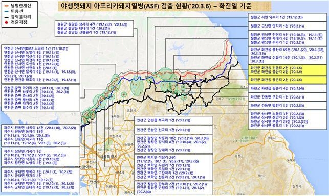 국립환경과학원은 3월 6일 폐사체 6개체에서 아프리카돼지열병 바이러스를 확진하고 결과를 관계기관에 통보했다. 이로써 화천군 130건, 연천군 100건, 파주시 68건, 철원군 22건, 총 320건의 멧돼지 아프리카돼지열병이 확진됐다. 폐사체는 야생멧돼지 아프리카돼지열병 표준행동지침에 따라 시료 채취 후 현장 소독과 함께 매몰하였다.