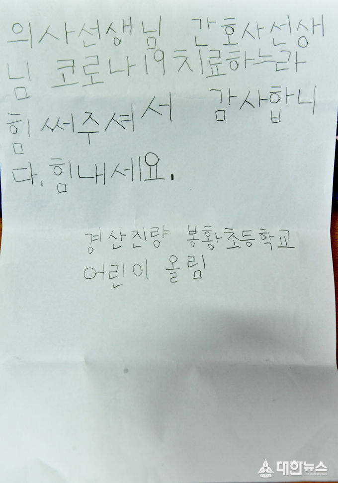 편지에는 “의사선생님, 간호사선생님 코로나19 치료하느라 힘써주셔서 감사합니다. 힘내세요”라는 내용을 담아 최일선에서 사투를 벌이고 있는 의료진들의 마음에 잔잔한 감동을 안겨주었다.