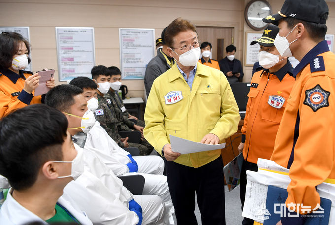 (대한뉴스 김기준 기자)=이철우 도지사가 10일 도 지정 생활치료센터인 경북소방학교를 찾아 방역·소독관리 및 의료지원 시설현황 등을 점검했다.