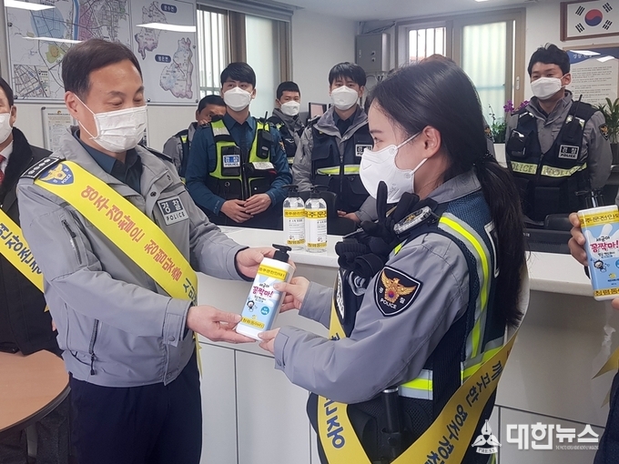 (대한뉴스 김기준 기자)=영주경찰서(서장 류창선)는 전국적으로 확산되고 있는 “코로나 19” 감염예방을 위하여 청렴동아리 회원들과 함께 최일선에서 근무하는 지역경찰을 방문하여 손 소독제와 핸드워시를 배부하면서 코로나 19 감염예방 활동을 전개하고 있다.