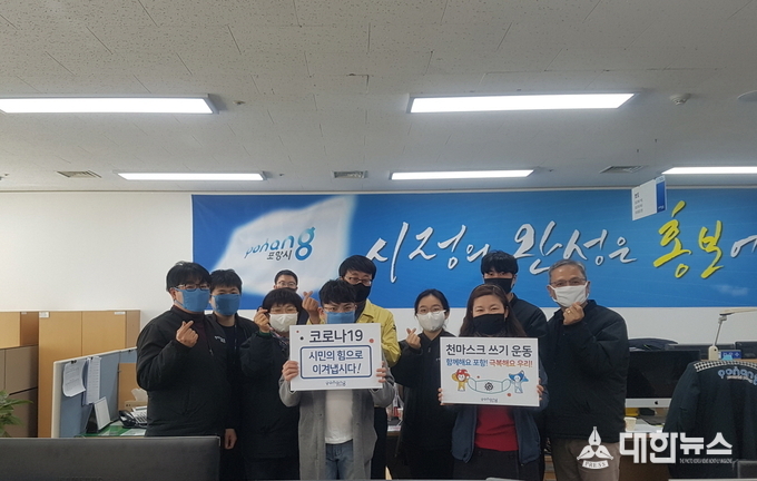 (대한뉴스 김기준 기자)=포항시 홍보담당관실 직원들은 ‘코로나19’로 보건용 마스크의 수급이 불안정한 가운데 11일부터 공무원들을 중심으로 ‘천 마스크 쓰기 릴레이 운동’을 펼치기로 했다.