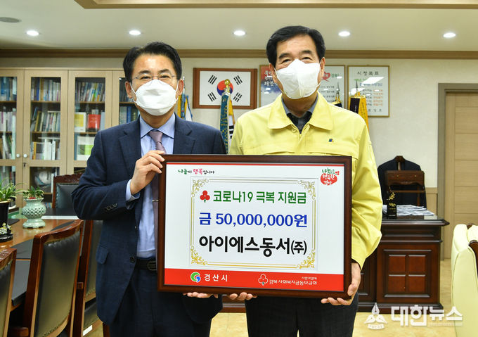 (대한뉴스 김기준 기자)=아이에스동서㈜(대표이사 권민석)에서는 코로나19 극복을 위해 12일 성금 5천만원을 경산시에 기탁했다.