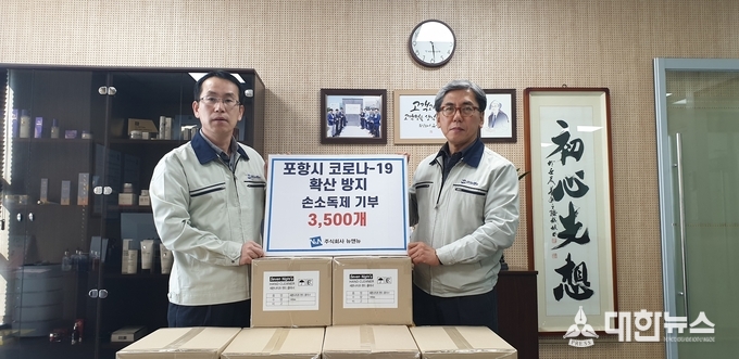 (대한뉴스 김기준 기자)=㈜뉴앤뉴(대표 이호영)는 13일 코로나19(신종코로나바이러스감염증)로 어려움을 겪고 있는 포항시민을 응원하기 위해 손 소독제 3,500개를 기부했다.