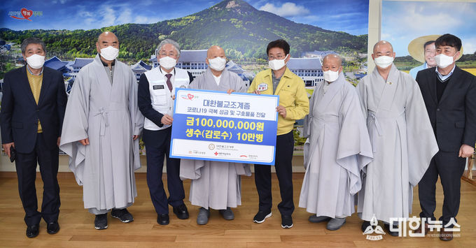 대한불교조계종 전 총무원장이자 동화사 회주인 의현스님과 현 총무원 총무부장이자 조계종 감염병 비상대응 본부장인 금곡스님은 13일 도청을 방문해 코로나 극복 성금 1억원과 생수(감로수) 10만병을 전달했다.