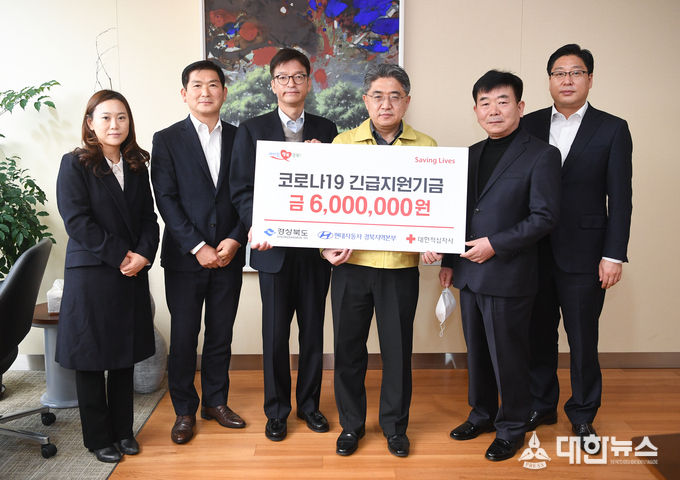 현대자동차(주)경북지역본부(본부장 차호연)도 성금 6백만원을 대한적십자사 경북지사를 통해 전달해 왔다. 이번 성금은 9일부터 12일까지 직원 600여명이 한마음 한뜻으로 모은 것으로 알려졌다. 차호연 본부장은 “도민들과 의료진들에게 작은 힘이나마 도움이 되고자 하는 마음”이라고 밝혔다.