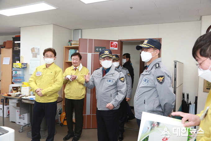“자체적으로 실시하고 있는 마스크 걸이, 비말 접촉 예방 가림막, 비상용 112상황실 마련 등 내부 방역활동이 모범적이다”고 했다.