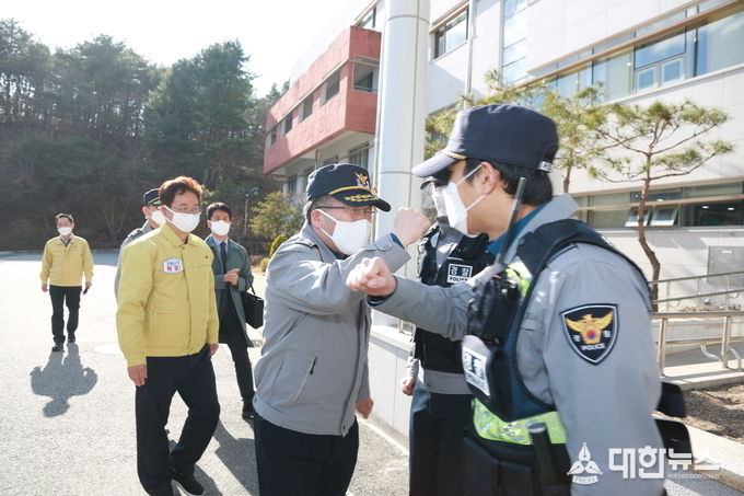 (대한뉴스 김기준 기자)=경찰청장(청장 민갑룡)이 3월 19일 오후 경북지방경찰청을 찾아 코로나19 대응 추진사항을 보고 받고 재난대책본부와 실무추진 TF 근무자를 격려했다.