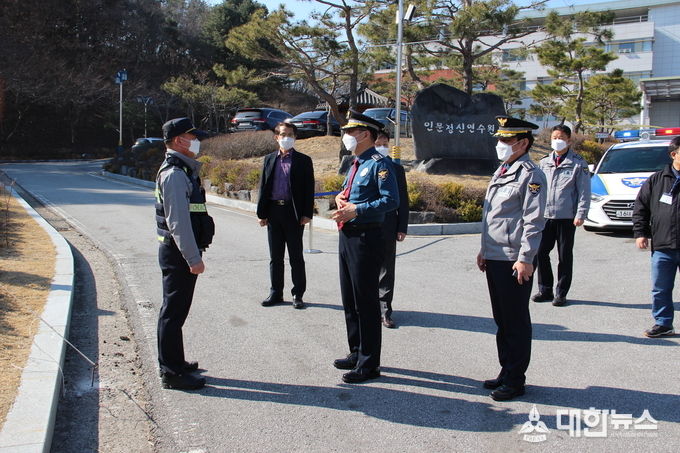 (대한뉴스 김기준 기자)=경북지방경찰청장(치안감 박건찬)은 월 18일 오후 안동경찰서를 방문하여 코로나19로 고생하는 직원들의 노고에 감사의 마음을 전달한 후, 코로나19 생활치료센터로 지정된 안동시 도산면 인문정신연수원을 방문하여 근무하는 직원들 노고에 격려했다.