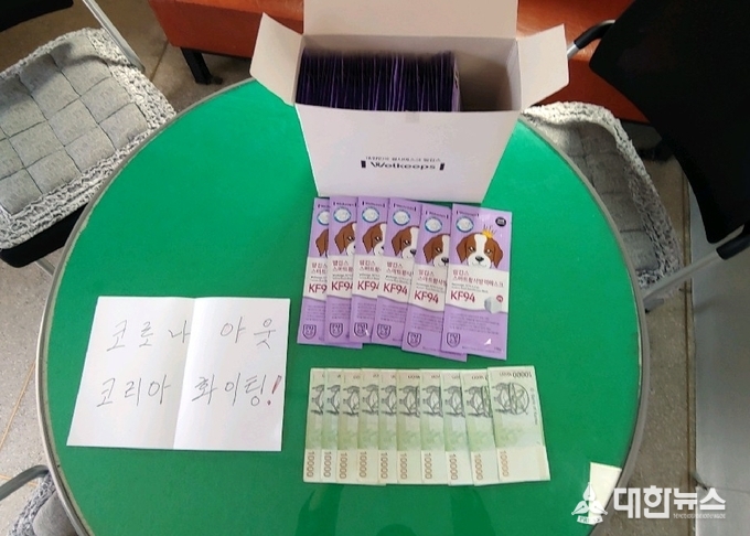 마스크와 현금이 있던 종이가방에는 “코로나 아웃, 코리아 파이팅!”이라는 직접 쓴 손편지가 담겨 있었다.