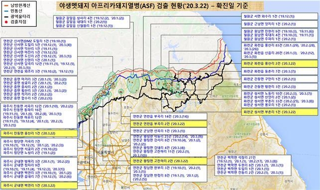 국립환경과학원은 3월 22일 폐사체 9개체에서 아프리카돼지열병 바이러스를 확진하고 결과를 관계기관에 통보했다. 이로써 화천군 163건, 연천군 154건, 파주시 76건, 철원군 22건, 총 415건의 멧돼지 아프리카돼지열병이 확진됐다. 폐사체는 야생멧돼지 아프리카돼지열병 표준행동지침에 따라 시료 채취 후 현장 소독과 함께 매몰했다.