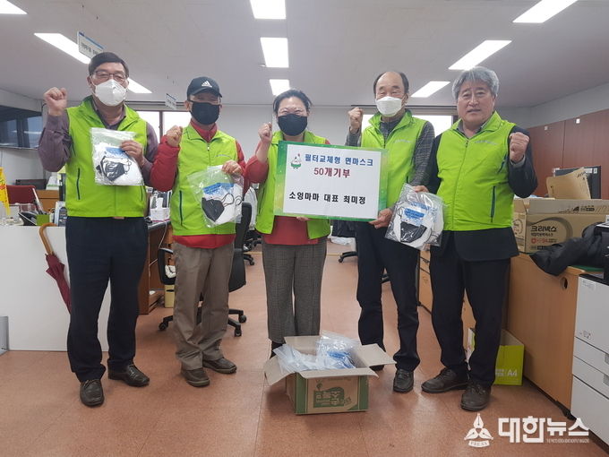 (대한뉴스 김기준 기자)=경북 영주시 휴천2동 지역사회보장협의체(공동위원장 안진용, 박이서)는 지난 19일 관내 나눔가게인 소잉마마(대표 최미정)에서 손수 제작해서 기부한 수제 마스크 50개와 마스크필터 1,000개를 소외계층에게 전달해 주변 사람들의 마음을 훈훈하게 하고 있다.