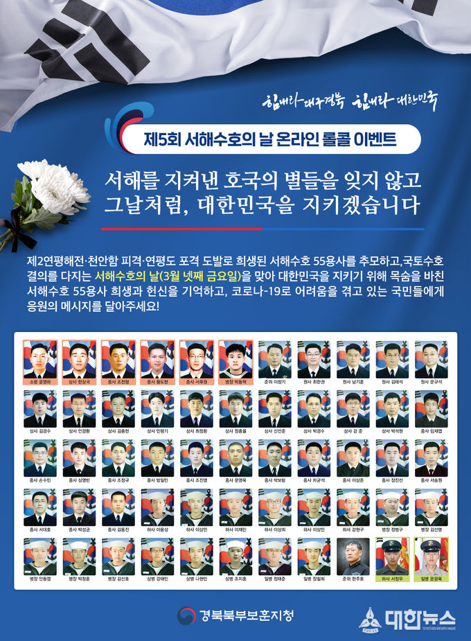 (대한뉴스 김기준 기자)=경북북부보훈지청(지청장 우진수)은 제5회 서해수호의 날을 맞아 29일까지 온라인을 통해 서해수호 55용사 롤콜 이벤트 및 추모 사진전을 개최한다.