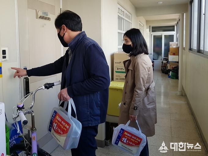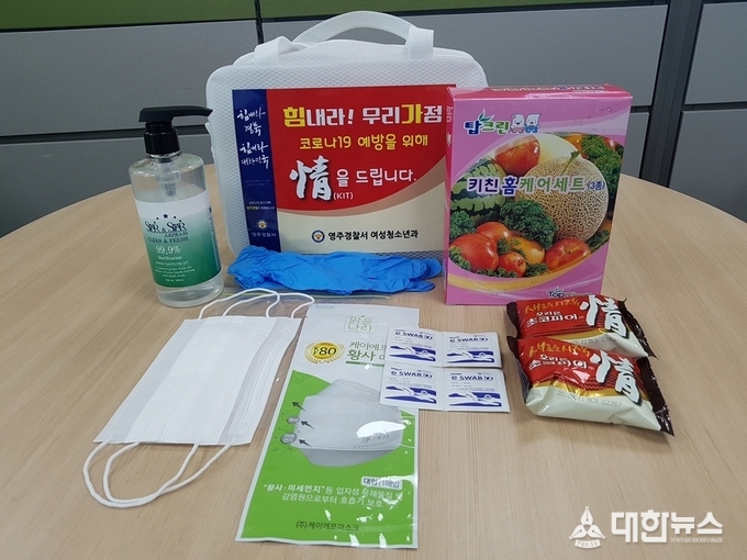 (대한뉴스 김기준 기자)=영주경찰서(총경 류창선)는 24일 심수경 여성청소년계장 등 직원 3명이 가정폭력 재발우려 가정 5개소를 방문해 코로나19 예방을 위한 마스크, 손 소독제, 위생장갑 등이 들어 있는 ‘情(정)키트’를 전달했다.