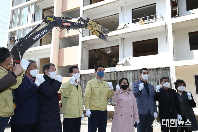 포항시는 24일, 북구 흥해읍의 대성아파트 A동의 철거를 시작으로 전파공동주택에 대한 보상협의가 끝난 5개 단지 433세대와 공동주택 12개동과 상가 1개동의 철거를 추진할 방침이다. 현재까지 이들에 대한 전체 보상은 96% 수준이다.