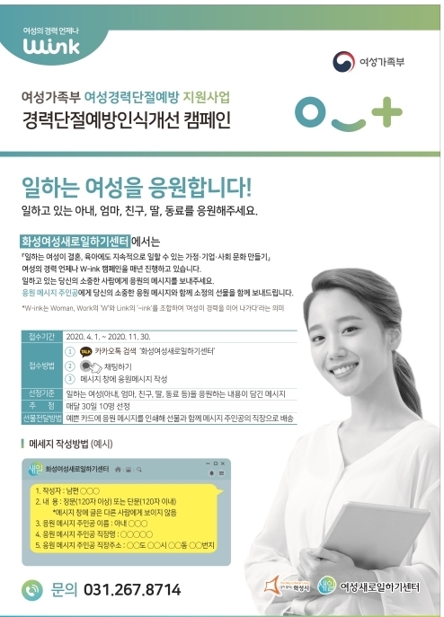 (대한뉴스 한원석 기자)=화성시여성가족청소년재단(대표이사 김진승) 화성여성새로일하기센터에서는 지역 사회 일·생활 균형문화 확산 및 여성 고용 유지 인식 개선을 위한 ‘윙크(W-ink) 캠페인’을 펼친다. 윙크(W-ink)는 일하는(work) 여성(woman)의 ‘W’와 연결(Link)의 합성어로, 여성(woman)의 경력(work)을 이어주는(Link) 캠페인을 의미한다.