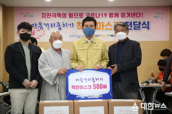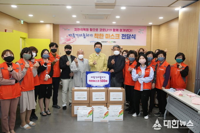 포항시는 2일 포항지진 트라우마센터에서 코로나19 위험에 취약한 시민들을 위해 지진피해주민이 직접 제작한 착한마스크 500매 전달식을 가졌다.