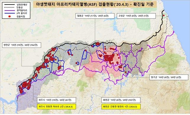 국립환경과학원은 4월 3일 멧돼지 폐사체 3개체에서 아프리카돼지열병 바이러스를 확진하고 결과를 관계기관에 통보했다. 이로써 화천군 188건, 연천군 181건, 파주시 88건, 철원군 23건, 양구군 2건, 고성군 1건, 총 483건의 멧돼지 아프리카돼지열병이 확진됐다. 폐사체는 야생멧돼지 아프리카돼지열병 표준행동지침에 따라 시료 채취 후 현장 소독과 함께 매몰했다.