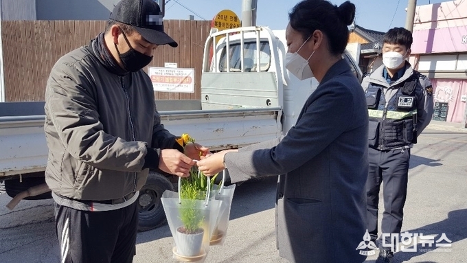 (대한뉴스 김기준 기자)=영주경찰서(서장 류창선)는 ◦6일 범죄피해자에게 마음의 치료를 위해 청렴동아리 회원들과 함께 꽃화분과 대한적십자사에서 제공하는 물품을 전달하고 빠른 쾌유를 기원했다.