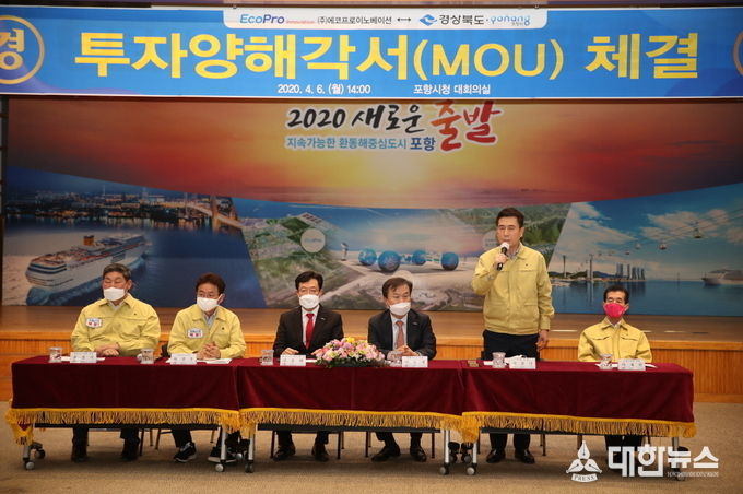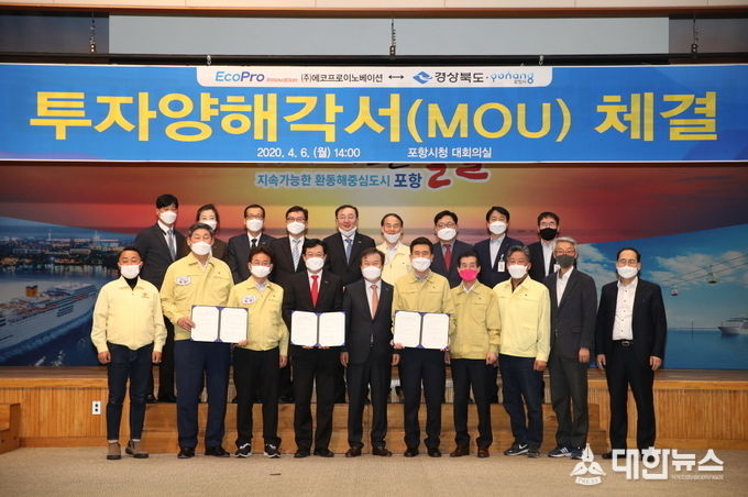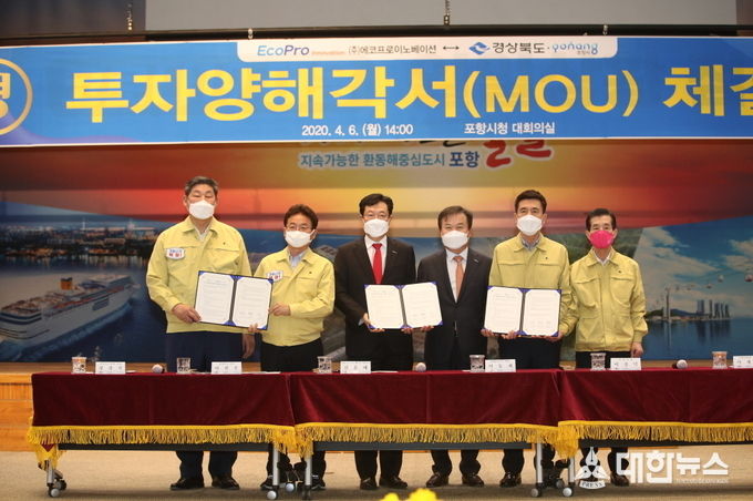 (대한뉴스 김기준 기자)=경상북도와 포항시는 6일 포항시청에서 이차전지 양극재용 수산화리튬 제조업체인 ㈜에코프로이노베이션과 투자양해각서를 체결했다.