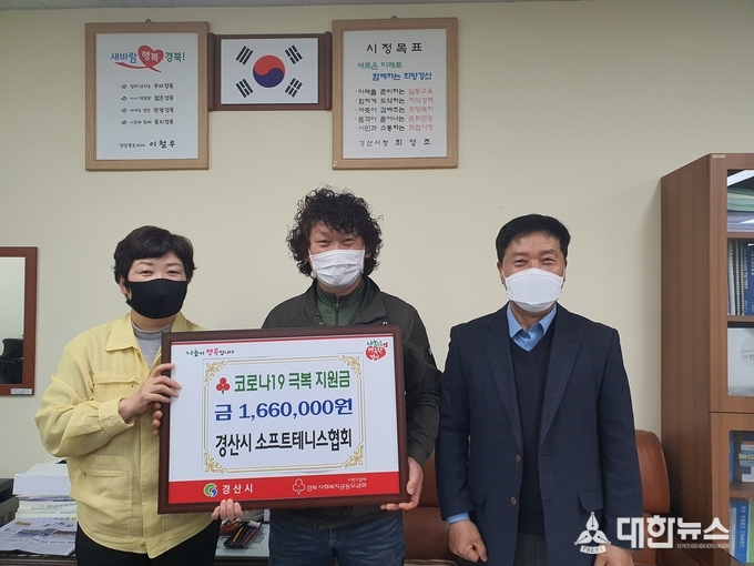 (대한뉴스 김기준 기자)=경산시 소프트테니스협회(회장 김세준)에서는 13일 코로나19 극복을 위해 써달라며 경산시에 성금 166만원을 기탁했다.