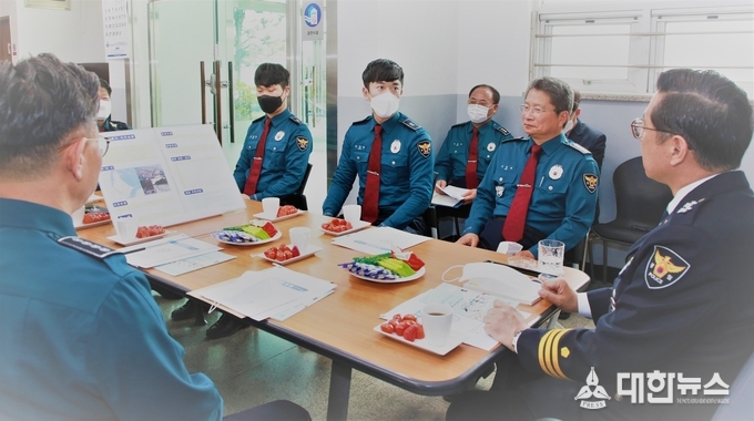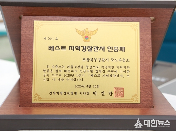 (대한뉴스 김기준 기자)=경북지방경찰청(청장 박건찬 치안감)은 4월 16일.(목) 포항북부와 포항남부경찰서를 각각 방문하여 1/4분기 ‘베스트 지역경찰과 외사경찰’, 편의점 강도상해 피의자 신속검거 유공자들에게 표창을 수여하고 현장근무자를 격려하였다.