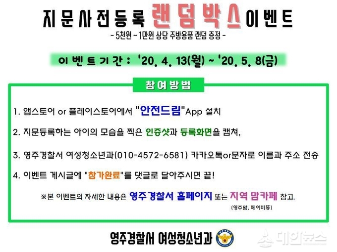 이벤트 진행 기간은 지난 4월 13일(월)부터 5월 8일(금)까지 4주간으로 이 기간에 「안전 Dream 앱」을 통해 지문등록을 하면 추첨을 통해 5천원~1만원 상당 주방용품이 들어있는 랜덤박스를 선물로 증정할 예정이다. 본 행사의 자세한 내용은 영주경찰서 홈페이지를 통해 확인할 수 있다.