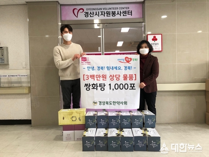 4월 6일(월), 경상북도 한약사회(회장 전지민)는 선별진료소 의료진 및 관계자들의 피로회복과 면역력을 높여주는데 도움을 주는 쌍화탕(1,000포, 300만원 상당)을 지원하였다.