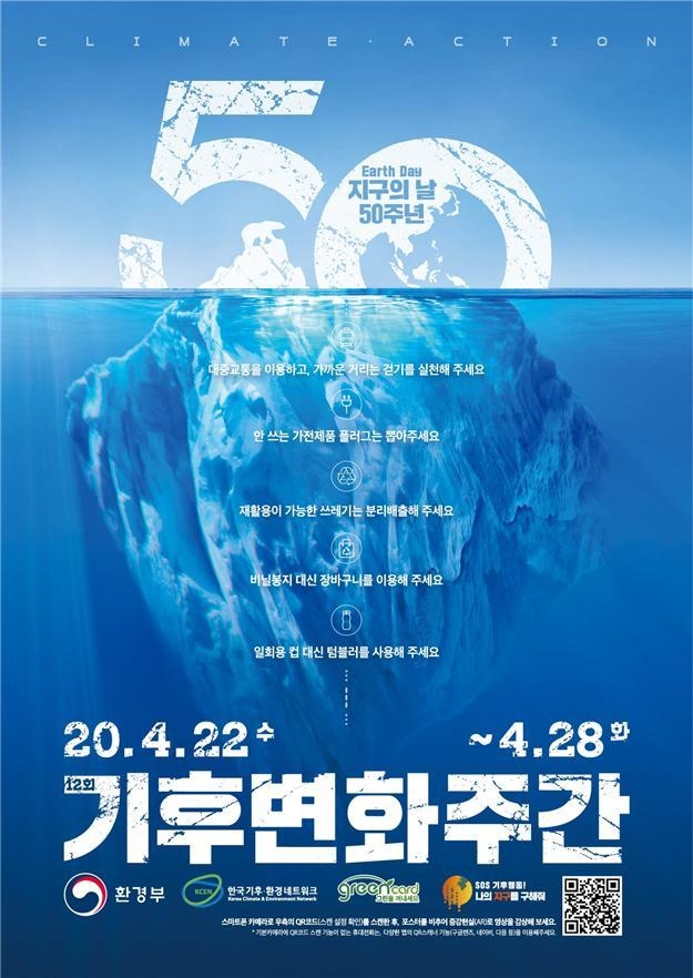 (대하뉴스 한원석 기자)=환경부(장관 조명래)는 50주년을 맞는 ‘지구의 날’을 기념하여 4월 22일부터 28일까지 제12회 기후변화주간을 운영하고, 생활 속에서 온실가스를 줄이기 위한 다양한 저탄소 실천 활동을 펼친다. 올해 기후변화주간 주제는 ‘에스오에스(SOS), 기후행동! 나의 지구를 구해줘’로, 지구가 보내는 구조신호에 응답하여 기후변화를 유발하는 온실가스를 줄이기 위한 우리의 기후행동을 지금, 바로 실천한다는 의미를 담고 있다.
