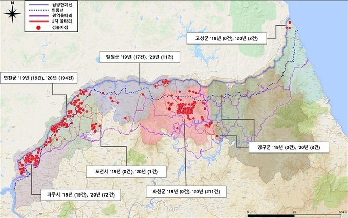 주간별로는 1월 중순 이후부터 주간 발생건수가 40여건 내외로 유지되다가 최근에는 소폭 감소하는 것으로 나타났다.검사한 멧돼지 시료에서 2019년 10월 이후 양성검출률은 연천군이 17.5%로 가장 높고, 화천군 17.4%, 파주시 14.1%, 철원군 1.9%, 양구군·포천시 0.5%, 고성군 0.4%의 순으로 나타났으며, 발생건수가 크게 늘었던 2월말에는 화천군과 연천군에서 양성검출률이 높게 나타났다.발생현황을 지역별로 보면, 임진강 이북 지역 3개면(장단면·군내면·진동면)에 한정되고 있는 파주는 1월까지 증가하다가 2월부터는 점차 줄어드는 경향을 보이고 있다.
