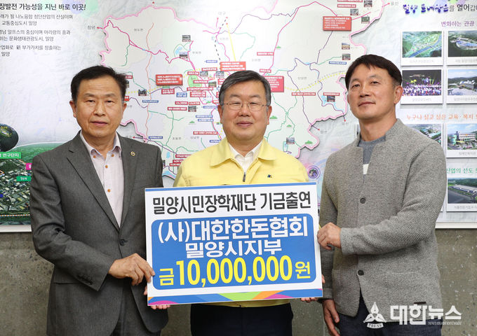 (대한뉴스 김기준 기자)=(재)밀양시민장학재단(이사장 박일호)은 22일 (사)대한한돈협회 밀양시지부(지부장 장세환)에서 지역우수인재 양성과 밀양지역 명문학교 육성지원을 위한 장학기금 1천만 원을 출연했다고 밝혔다.