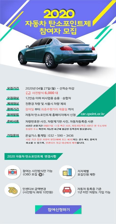 (대한뉴스 한원석 기자)=환경부 산하 한국환경공단(이사장 장준영)은 4월 27일부터 ’2020년 자동차 탄소포인트제’ 참여자를 자동차 탄소포인트 누리집을 통해 선착순으로 모집한다. 자동차 탄소포인트제는 운전자가 주행거리를 단축하거나, 급가속·급제동을 하지 않고 친환경 운전을 했을 경우, 실적에 따라 탄소포인트를 지급하는 제도다.
