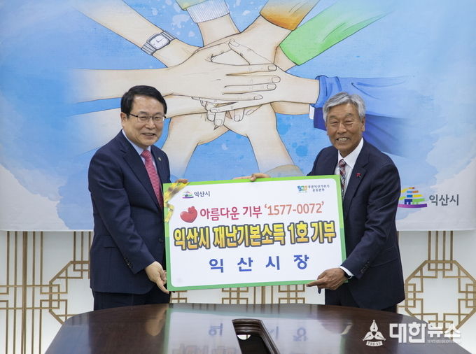 (대한뉴스 박청식 기자)=정헌율 익산시장이 새로운 기부문화에 붐을 일으키고자 지난 28일 전국 최초 도입한 기부콜센터(☎ 1577-0072)를 이용해 재난기본소득 1호 기부자로 첫 테이프 끊었다.
