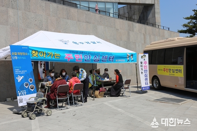 (대한뉴스 김기준 기자)=영주경찰서(서장 류창선)는 29일 풍기읍사무소 긴급재난지원금 신청과 함께 치안 소외지역 주민을 위한 ‘찾아가는 주민안심센터’를 운영 하였다.