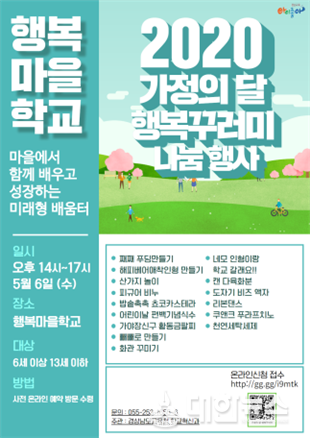 (대한뉴스 김기준 기자)=경상남도교육청 행복마을학교는 5월 가정의 달을 맞아 어린이와 학부모가 함께 즐겁게 배울 수 있는 ‘행복꾸러미’ 나눔행사를 연다.