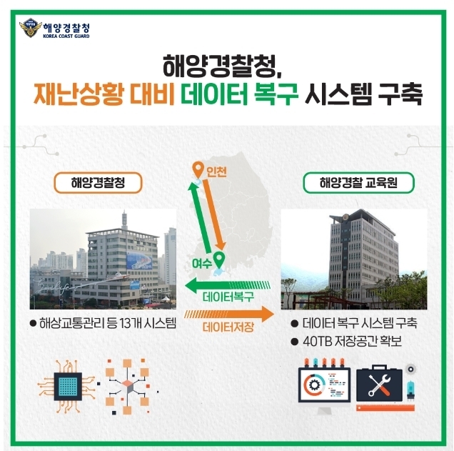 해양경찰청은 해양안전과 치안업무에 필요한 해상교통관리 등 13개 안전정보 시스템을 운영하며 방대한 데이터를 보유하고 있다. 이번에 해양경찰교육원(여수 소재)에 구축된 시스템은 불시 재난 상황에 해양경찰청(인천 소재) 데이터가 손상돼도 신속하게 복구한다.이로써 해양경찰청은 재난 상황에도 임무를 수행하는데 중요한 연속성을 보장할 수 있게 됐다.