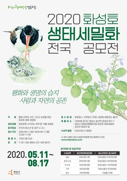 공모전 참여를 희망하는 지원자는 화성호 자생 동·식물을 4절지(성인) 또는 8절지(청소년)에 담아, 오는 11일부터 8월 17일까지 화성시생태관광협동조합으로 우편 또는 방문 접수하면 된다. 접수된 작품은 성인부와 청소년부를 구분해 대상 3점, 최우수상 3점, 우수상 9점, 가작 9점, 입선 18점 등 총 42점을 선정한다. 당선작은 ‘2020 화성 생태평화 행사’ 등 관내 순회전시를 통해 시민과 만날 예정이다.