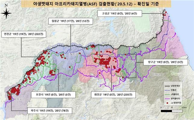 (대한뉴스 한원석 기자)=환경부(장관 조명래)는 지난 6일간(5월 7일~12일) 경기도 연천군, 포천시와 강원도 화천군, 고성군에서 아프리카돼지열병 8건이 추가로 발생하여 현재까지 총 612건 이 발생했다고 밝혔다.