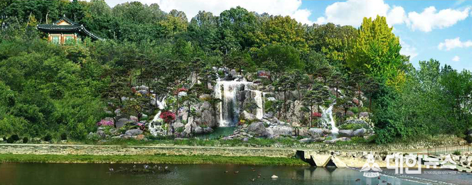 현재까지 총 8억원의 사업비를 확보해 시행중에 있으며, 최고 높이 14m, 폭 40m 규모의 주 폭포 1개와 보조 폭포 2개로 조성될 예정으로 본격적인 하절기가 시작되기 전까지 완료를 목표로 현재 순조롭게 진행되고 있다.
