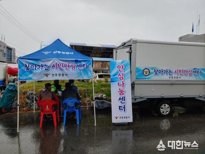 (대한뉴스 김기준 기자)=안동경찰서(서장 김우락)은 지난 15일 길안면 장날을 찾아가 ‘시민안심센터’를 운영했다.