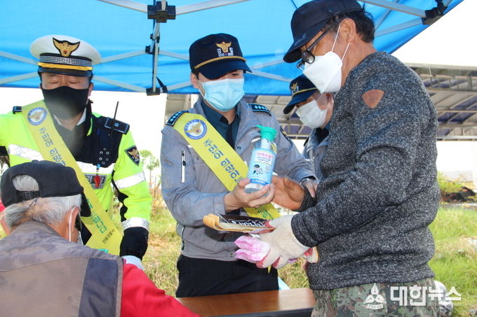 특히 이날은 주민이 원하는 장소에 순찰을 해주는 탄력순찰 홍보문구가 부착된 손소독제를 배부해 코로나19 예방에도 힘썼다.