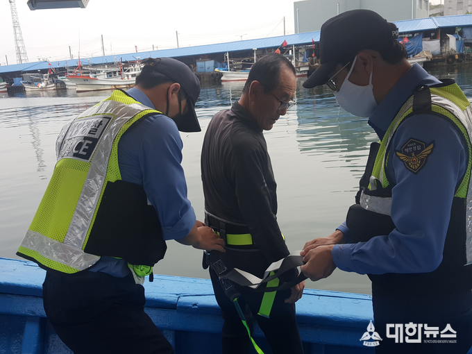 (대한뉴스 김기준 기자)=동해해양경찰서(서장 권오성)는 삼척수협(조합장 박수진)과 업무협업을 통해 어업인의 노령화로 1인 조업선 증가와 기상악화로 인한 해상 추락 등 인명사고 예방을 위해 해상추락 방지용 안전벨트를 보급 추진한다고 밝혔다.