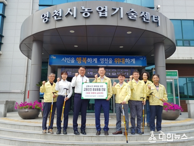 (대한뉴스 김기준 기자)=영천시(시장 최기문)는 지난 21일 영천시농업기술센터에서 보행자 교통사고 예방 공동 홍보를 위해 영천경찰서(서장 최준영) 김종호 경비교통과장 외 관계 공무원 6명이 참석한 가운데 안전용품인 야광 반사지 부착 효도지팡이 600개를 영천경찰서에 전달했다.
