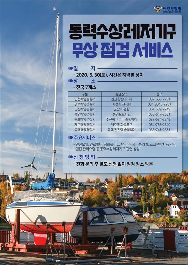 (대한뉴스 한원석 기자)=해양경찰청(청장 김홍희)은 수상레저 활동 성수기가 도래함에 따라 오는 30일 전국 7개 장소에서 국내 주요 수상레저기구 판매‧수리업체와 함께 레저보트 등 동력수상레저기구 무상 점검 서비스를 실시한다고 26일 밝혔다.