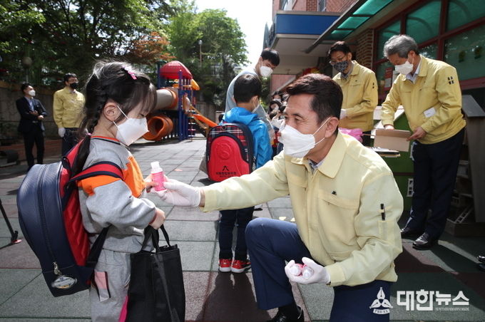 (대한뉴스 김기준 기자)=이강덕 포항시장은 27일, 코로나19로 인해 유치원과 초등학교 1~2학년이 첫 등교함에 따라 이동초등학교와 이동한빛유치원을 찾아 난생 처음 등교하는 새내기 학생들을 축하하고 격려했다.