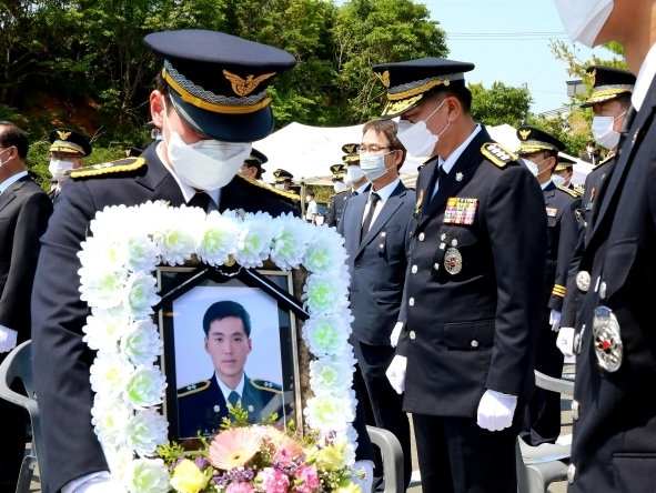 (대한뉴스 한원석 기자)=지난 6일 통영 홍도 해상 동굴에 갇힌 다이버들을 구조하다 안타깝게 순직한 통영해양경찰서 故정호종 경장의 영결식이 9일 오전 10시 30분 통영서울병원 장례식장에서 엄수됐다.