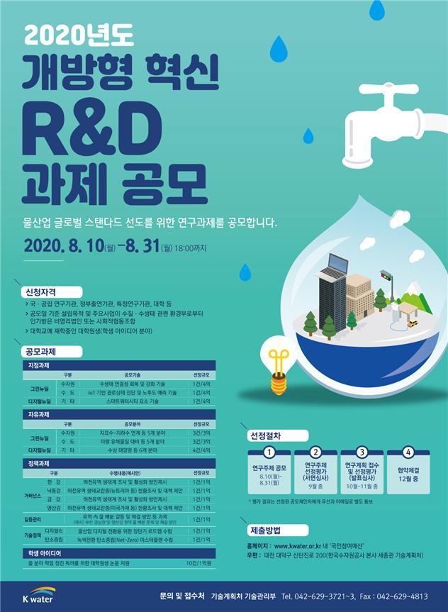 (대한뉴스 한원석 기자)=환경부 산하 한국수자원공사(사장 박재현)는 수요자인 국민 중심의 물관리 강화를 위해 국내의 대학과 정부출연기관, 연구기관 등을 대상으로 8월 10일부터 31일까지 ‘개방형 혁신 연구 개발(R&D)’ 과제를 공모한다.